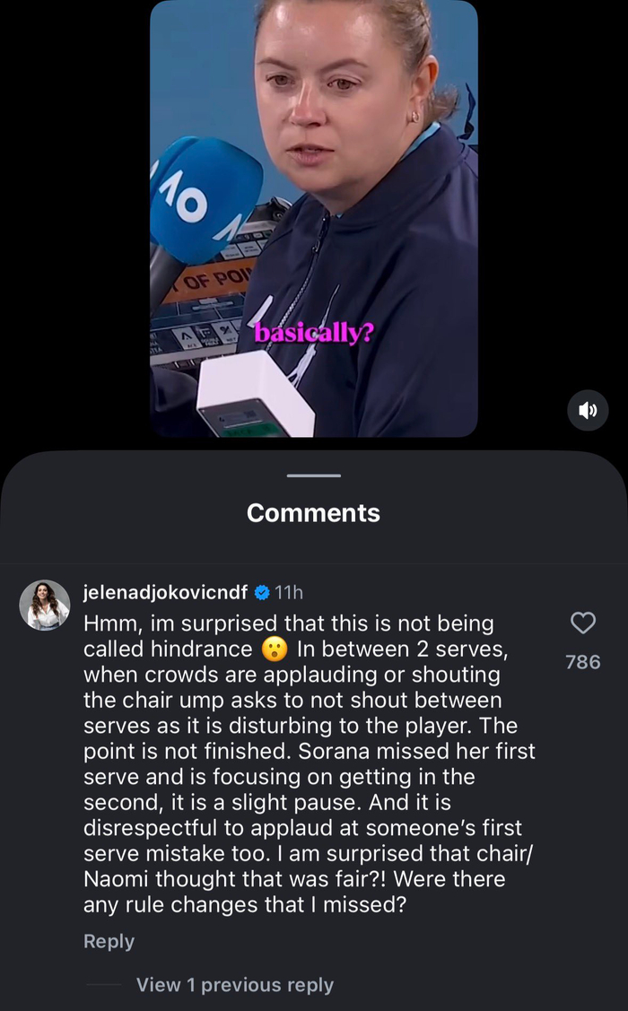 “嗯,我很惊讶这居然没有被判为妨碍比赛。在两次发球之间,如果观众鼓掌或喊叫,主裁判都会要求他们安静,因为这会干扰球员。此时这一分并没有结束。索拉娜刚刚一发失误,正专注于把二发发进场,这是一个短暂的停顿。而且,在别人一发失误后鼓掌本身也是不尊重的。我很惊讶主裁/大坂会觉得这很公平?!是不是我错过了什么规则的改动?”